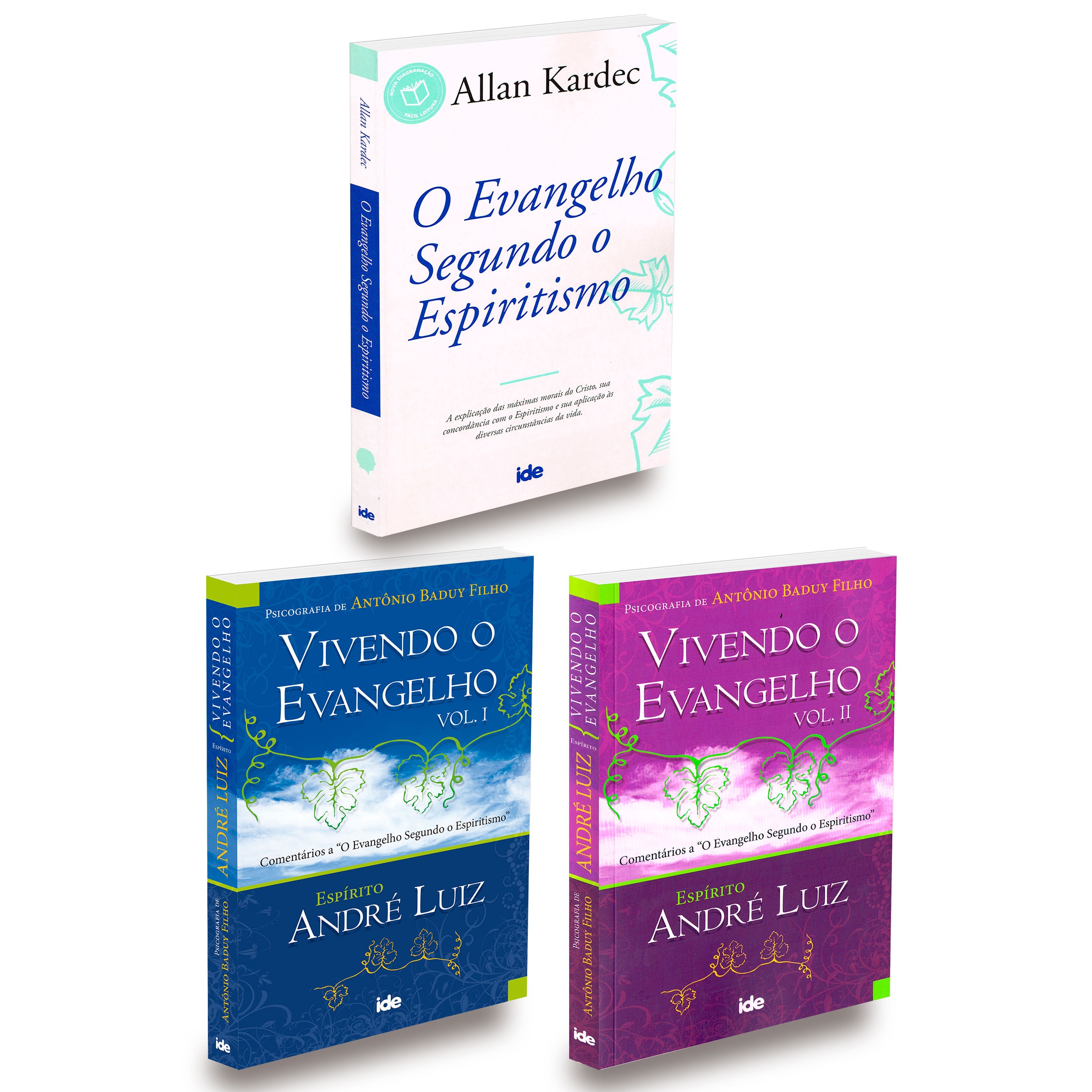 LIVROS NOVOS E FÍSICOS Este Kit Contém 1 exemplar de cada: Vivendo o Evangelho - Vol. 1 - 304 páginas - 14.00 x 21.00 - Médium: Antônio Baduy Filho / Ditado por: André Luiz Vivendo o Evangelho - Vol. 2 - 320 páginas - 14.00 x21,00 - Médium: Antônio Baduy Filho / Ditado por: André Luiz Evangelho Segundo o Espiritismo (O) - 14x21 Nova Edição - 320 páginas - Autor: Allan Kardec / Tradução: Salvador Gentile